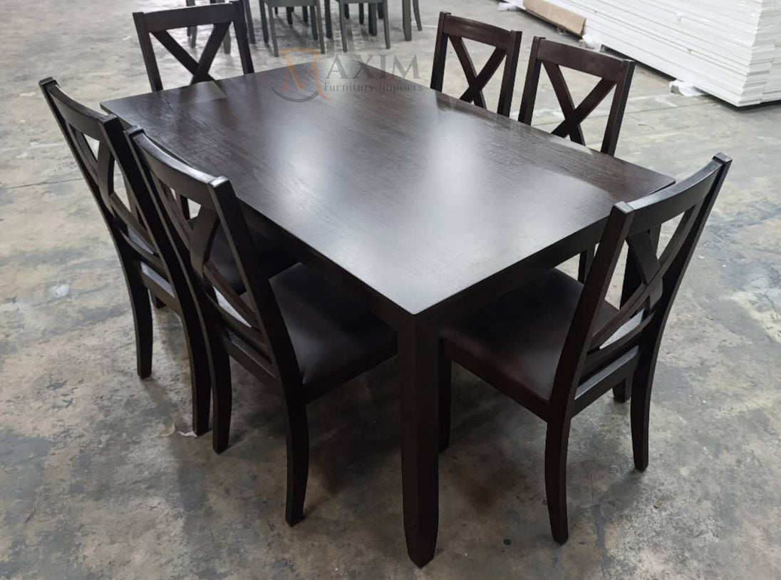- Chairs feature a wooden cross back with dark PU Leather Upholstery